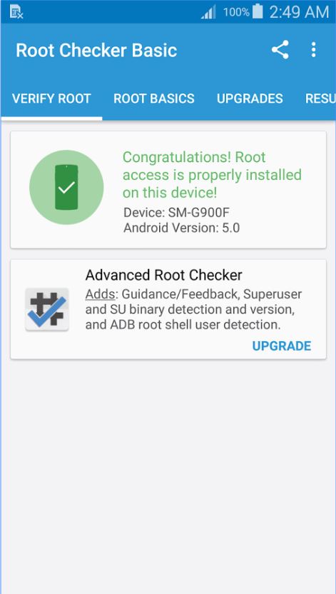 If the Superuser management applications (SuperSU, Superuser, etc.) are installed and working properly, these applications will prompt the user to accept or deny the root access request from Root Checker. Accepting the request will allow Root Checker to check for and confirm root access. Denying the request will result in Root Checker reporting no root access.